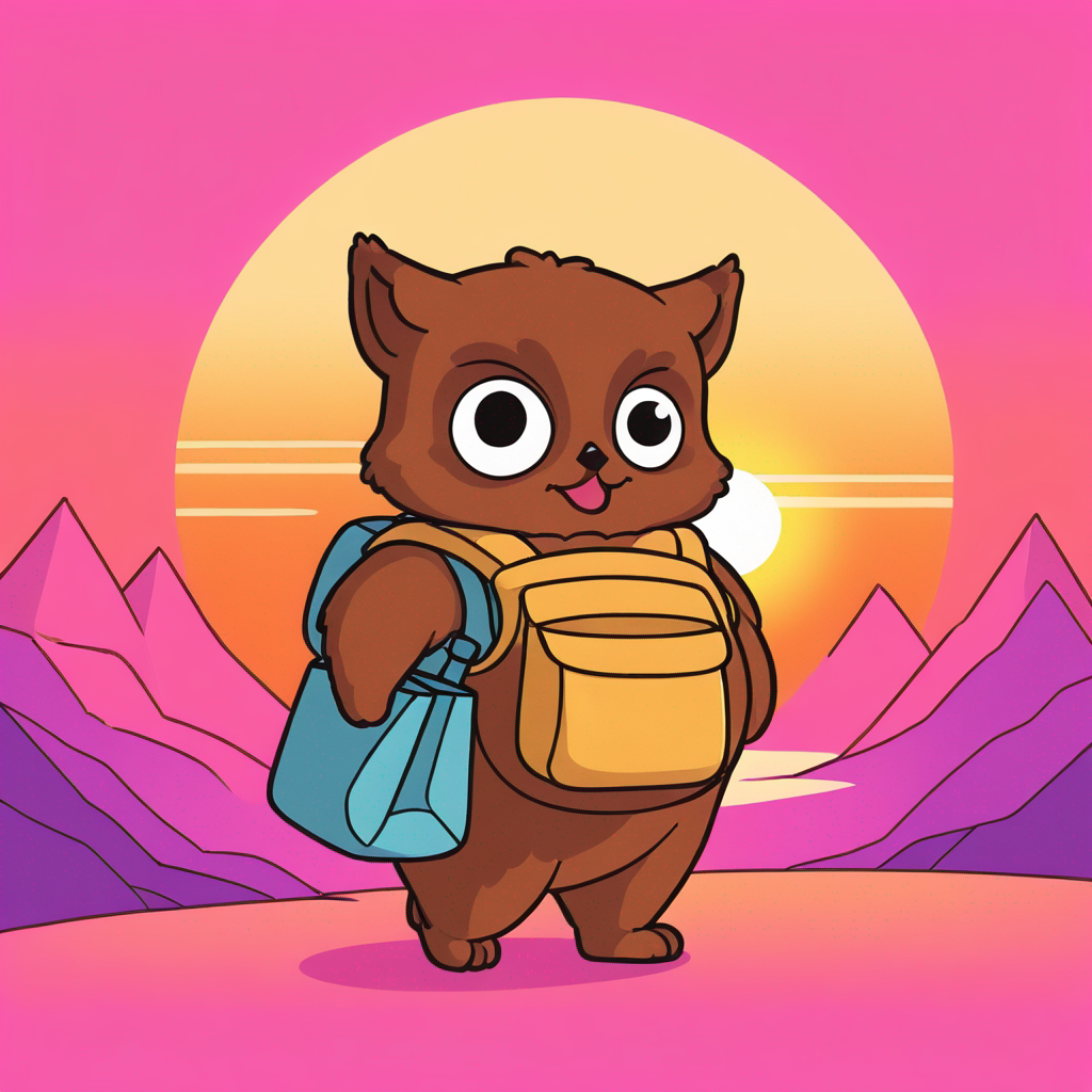 A fuddie holding two bags and walking into the sunset