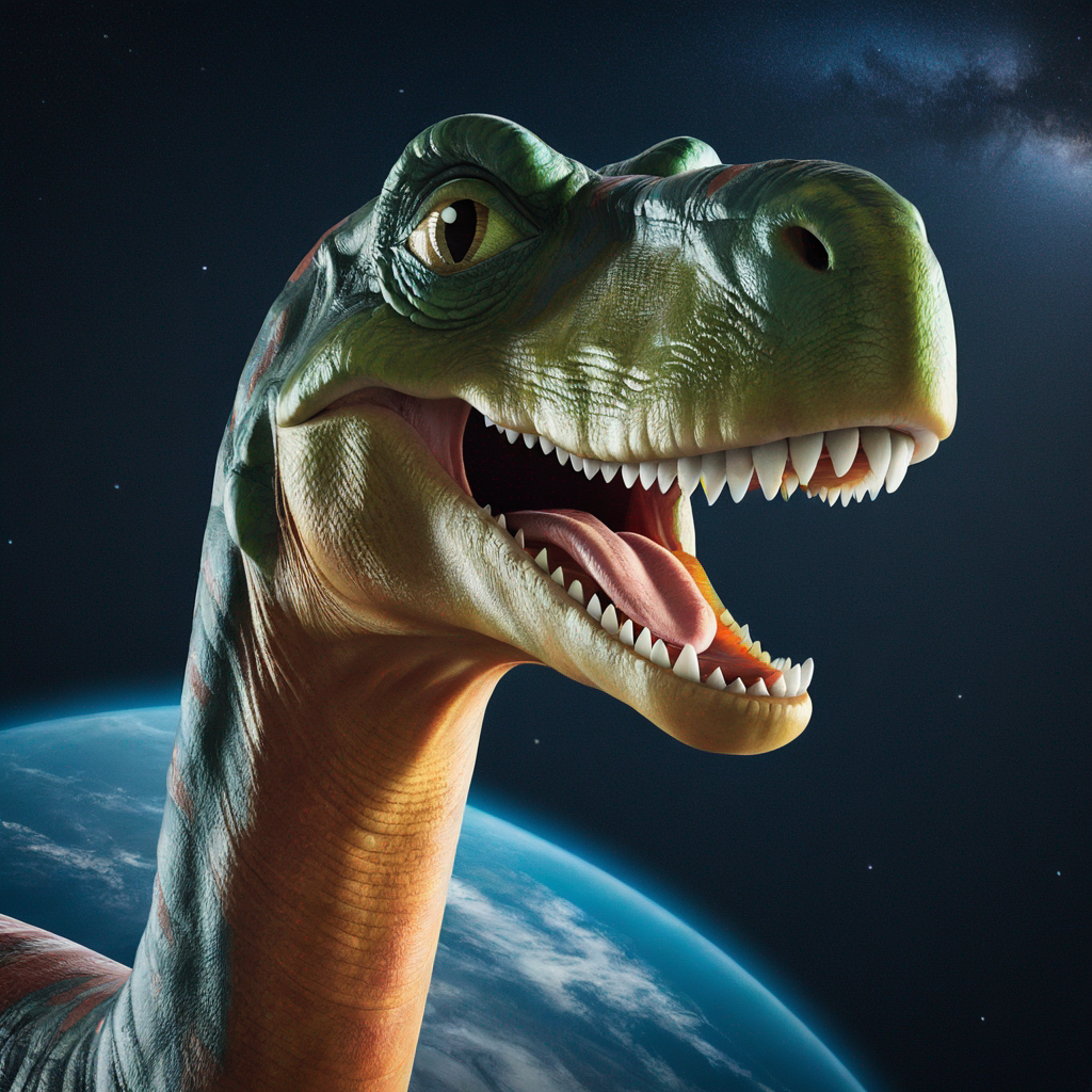 breathtaking selfie photograph of dinosaur floating in space, earth in the background. award-winning, professional, highly detailed