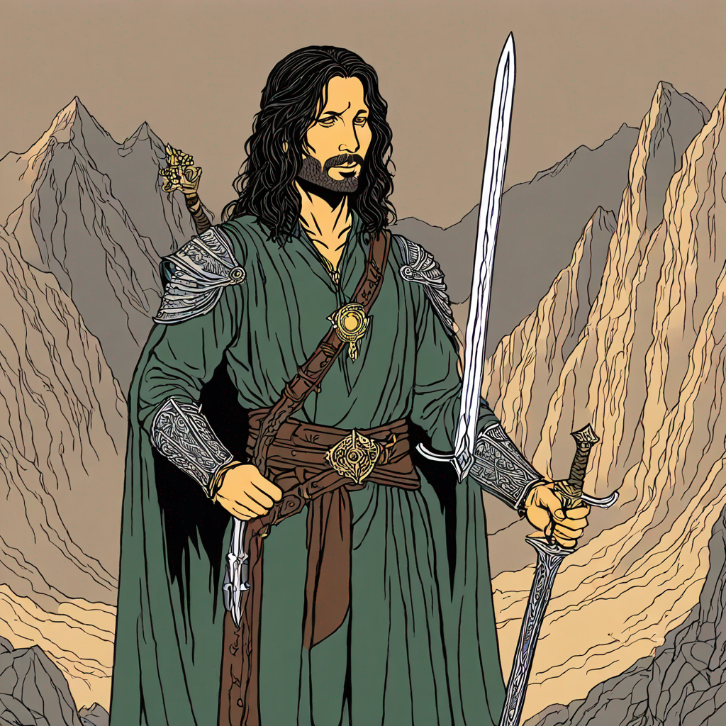 a DeGod in Lord of the Rings, being dressed like Aragorn, with a sword in hand