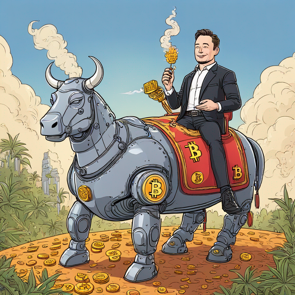 Grok robot riding a bitcoin bull with Elon musk while smoking a joint