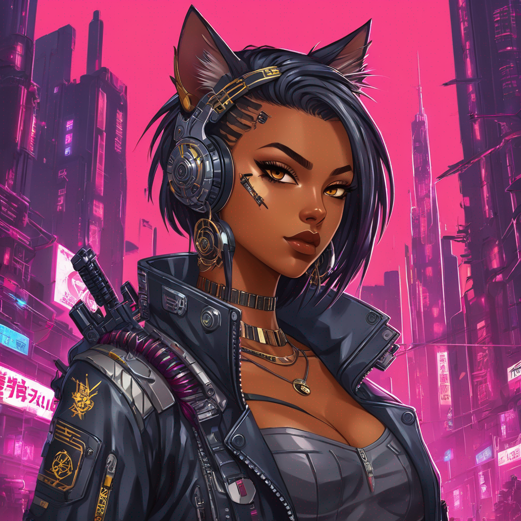 brown skinned girl with deadlocks, in cyber punk anime style, with cyberpunk weapons, the background matched the cyber punk city, and winged liner black eyes, with a tough mature face, with a cyber punk cyborg cat on the shoulder