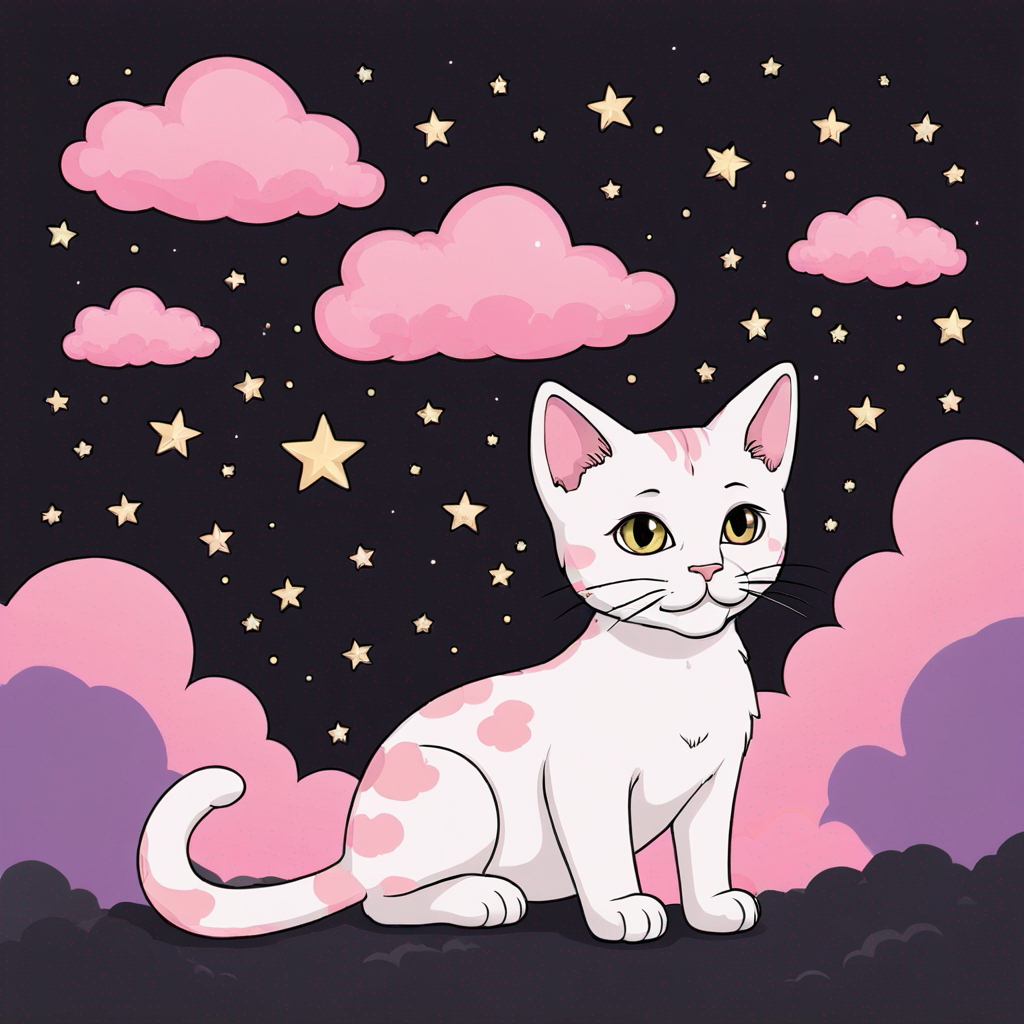 a happy cets in heaven with pink clouds and stars on a dark space sky