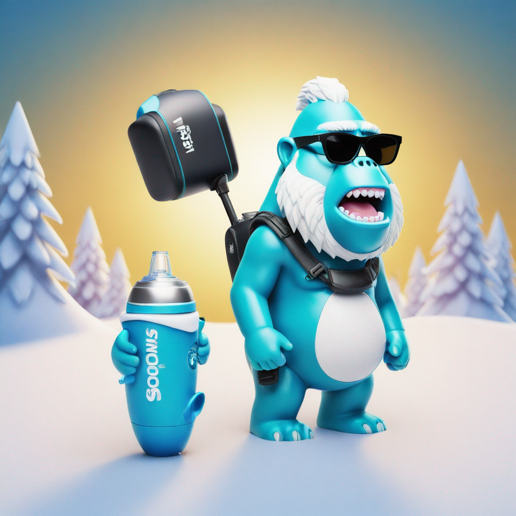 very lite blue yeti toddler with sunglasses standing on the snow with a sunny background, extra shadows