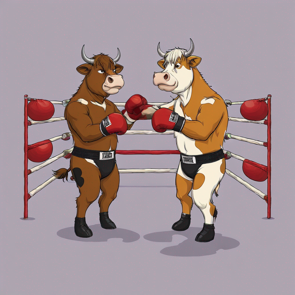 two cows fighting in a boxing ring
