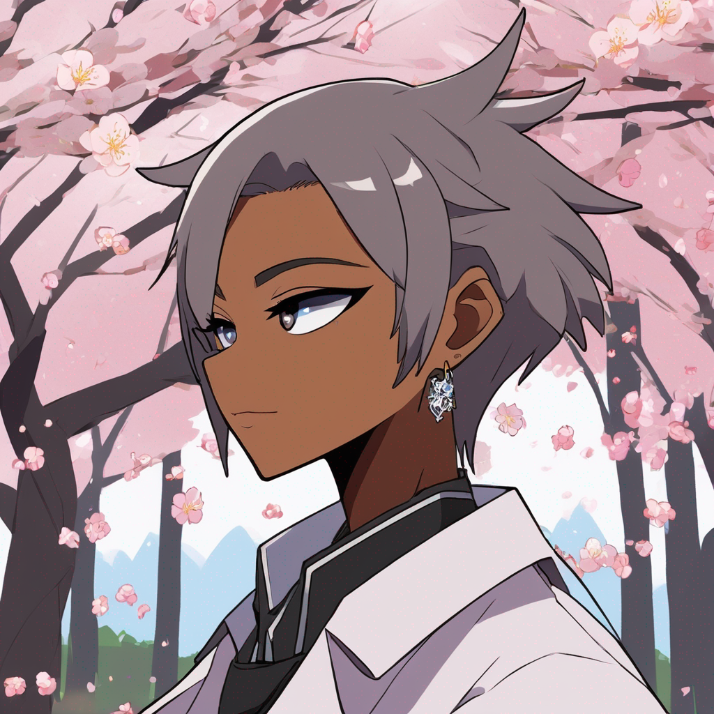 standing in a field of sakura blossom trees, wind is blowing, petals falling