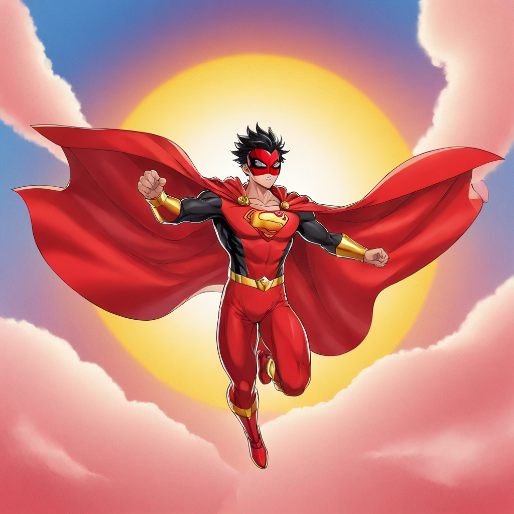 flying in the air, wearing a mask, red cape, sun shining