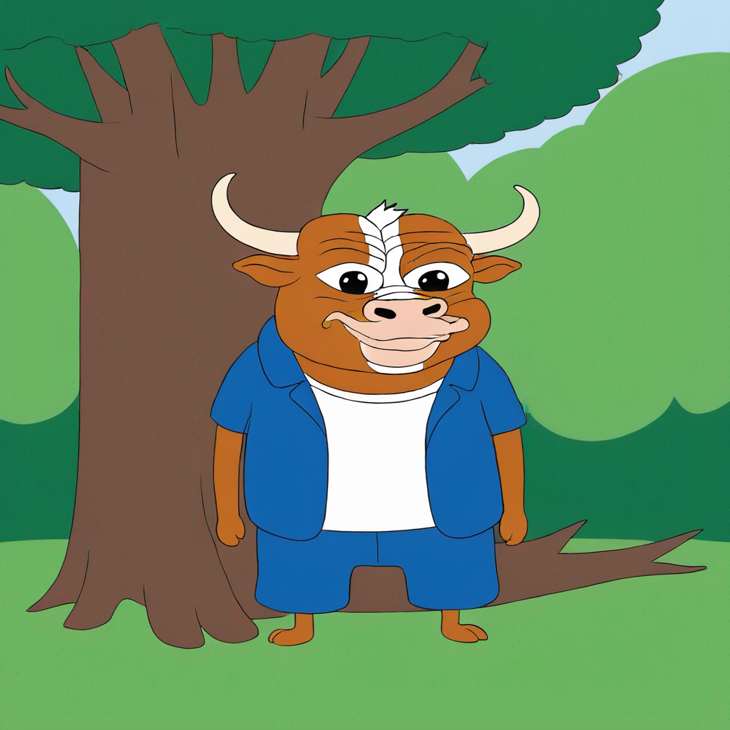 mumu the bull, sitting against a tree, looking drunk after a big night