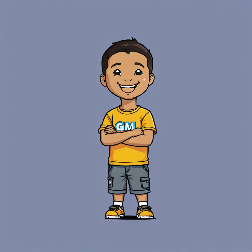 litte guy saying "GM!" at a big banner, smiles and somkes a joint
