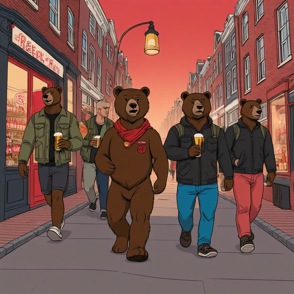 Okay bear strolling through red light district in Amsterdam with friends, joint in right hand, beer bottle in left hand, realistic, walking with friends