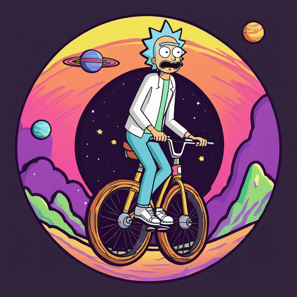 Rick and Morty driving a unicycle on Saturn rings