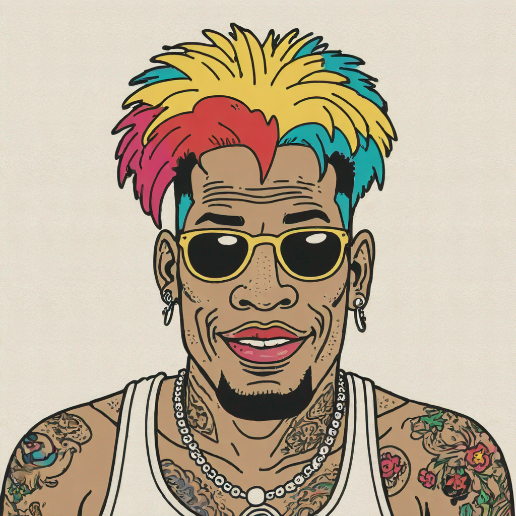 a dennis rodman with rainbow hairs - no sunglasses - shirtless - with his tattoos