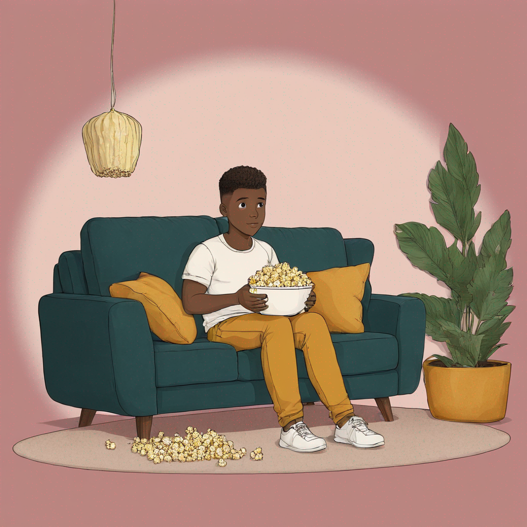 a Cow Cow sitting on the couch, watching tv, eating popcorn
