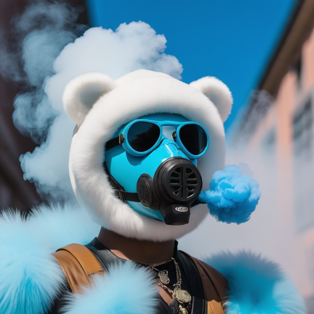 Gas masked wrapped in bear fur with a luscious cloud of light blue smoke puff