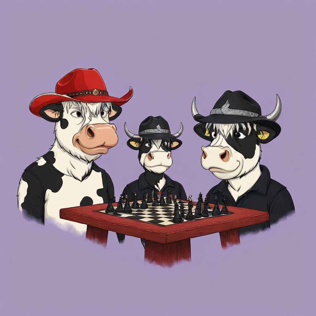 2 cows playing chess, one has a red baseball cap, one has a black cowboy hat