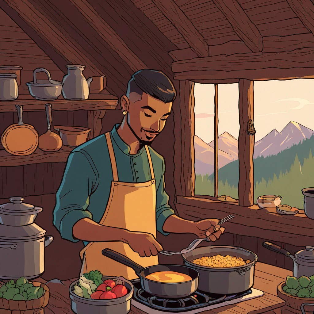 a lotus lad cooking dinner in a remote mountain cabin