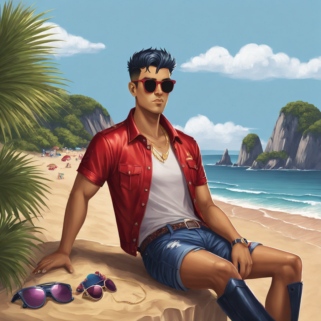 sitting on a beach, sunglasses on