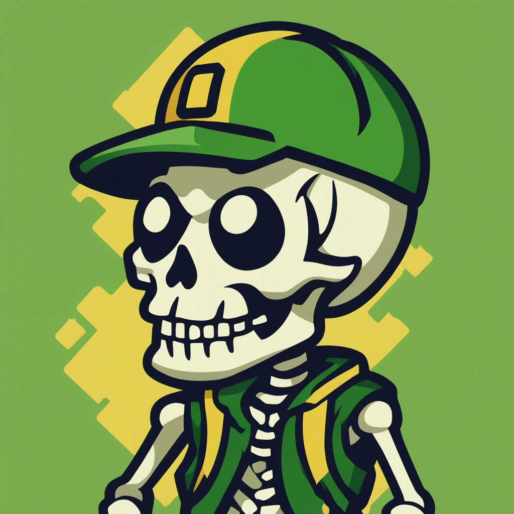 high detail portrait looking to the right of a naked skeleton wearing a green forward facing baseball hay with a yellow background and deep seeded anger in its eyes