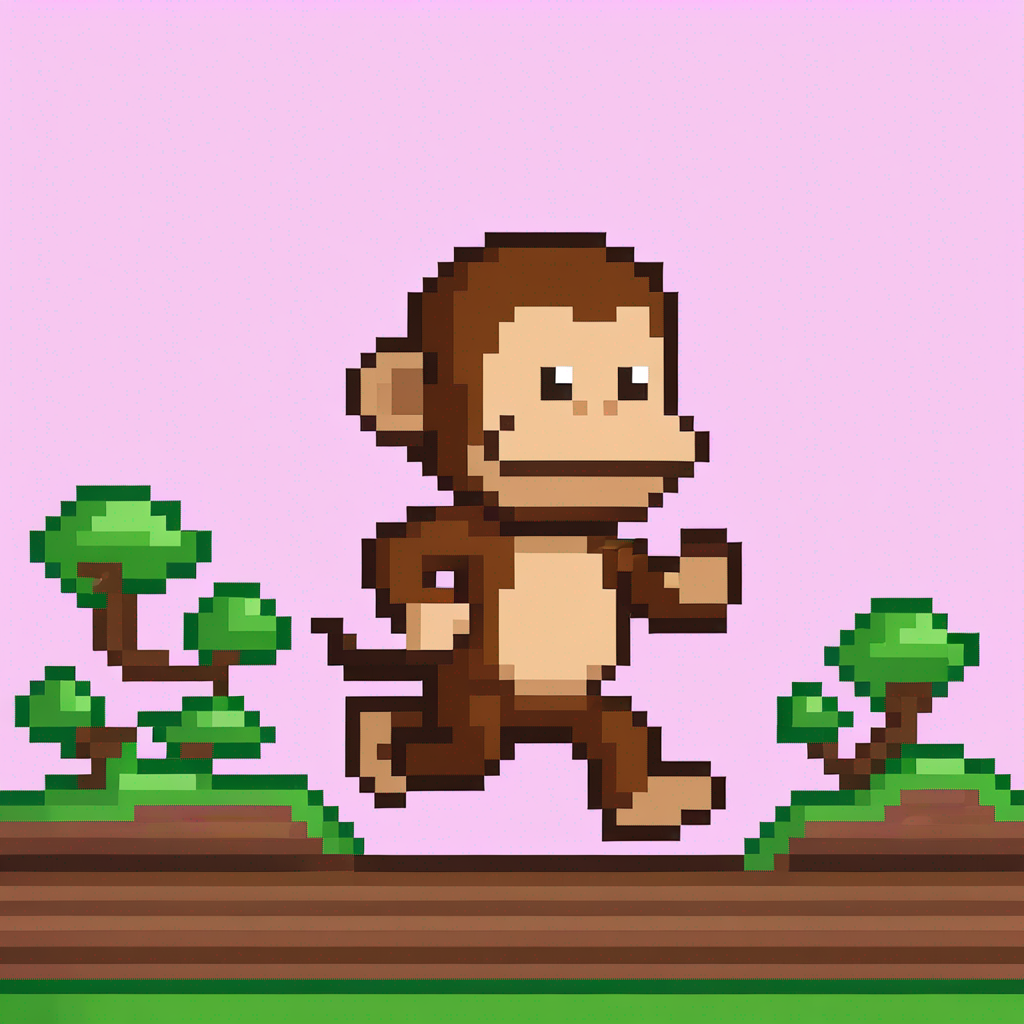 Pixel art of an 8-bit video game monkey running through a retro platformer level.