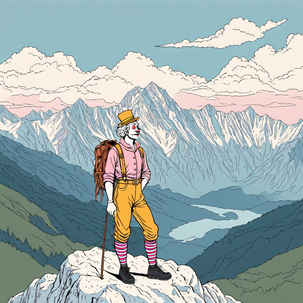 Degod with pastel skin hiking in the Austrian alps, wearing a Lederhose, top of the mountain over the clouds, clown is watching from distance