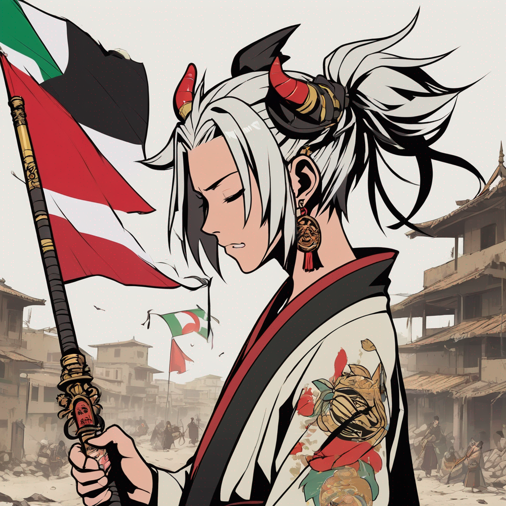 an azuki holding a palastine flag on the walls of gaza, ruined gaza city at the background