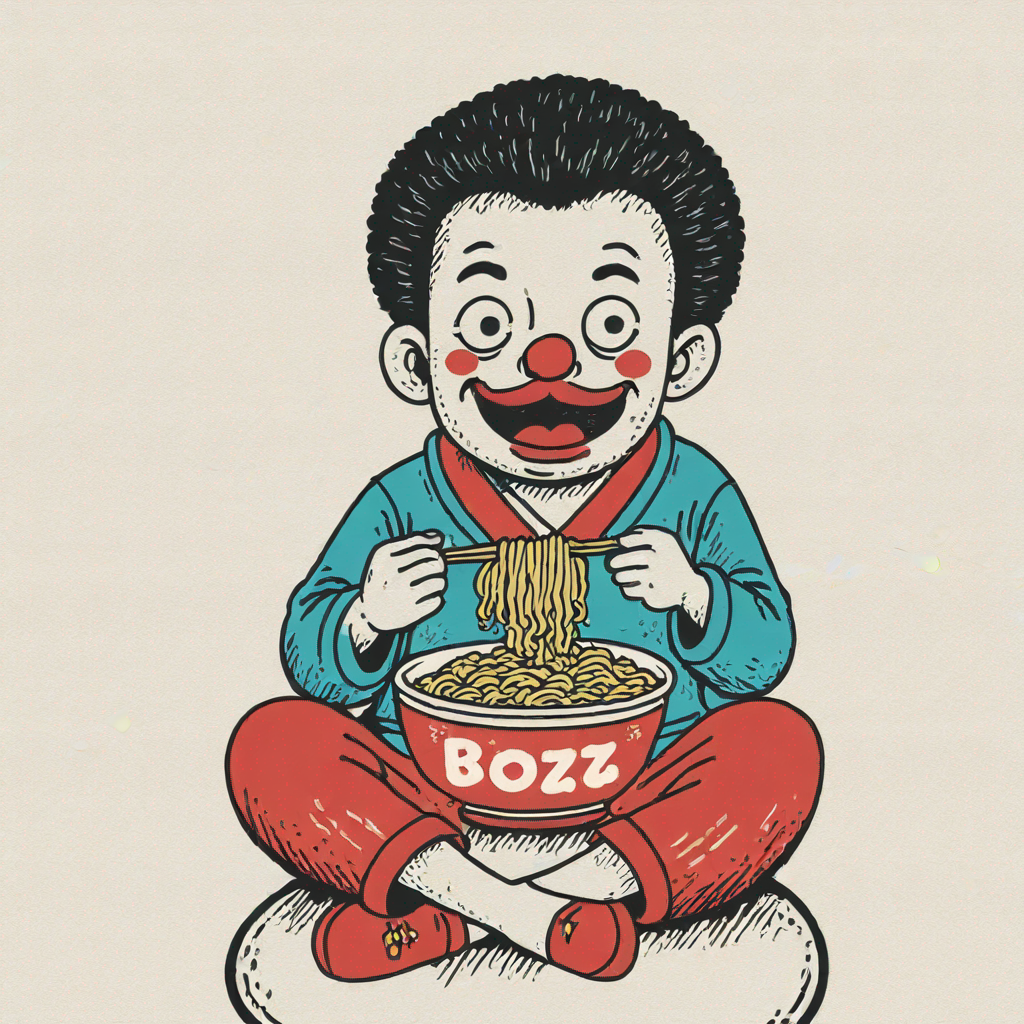 a bozo eating a bowl of ramen while watching tv