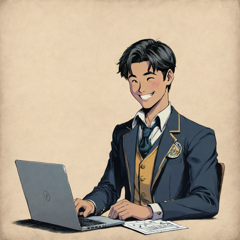 a smiling lad looking at charts on a laptop