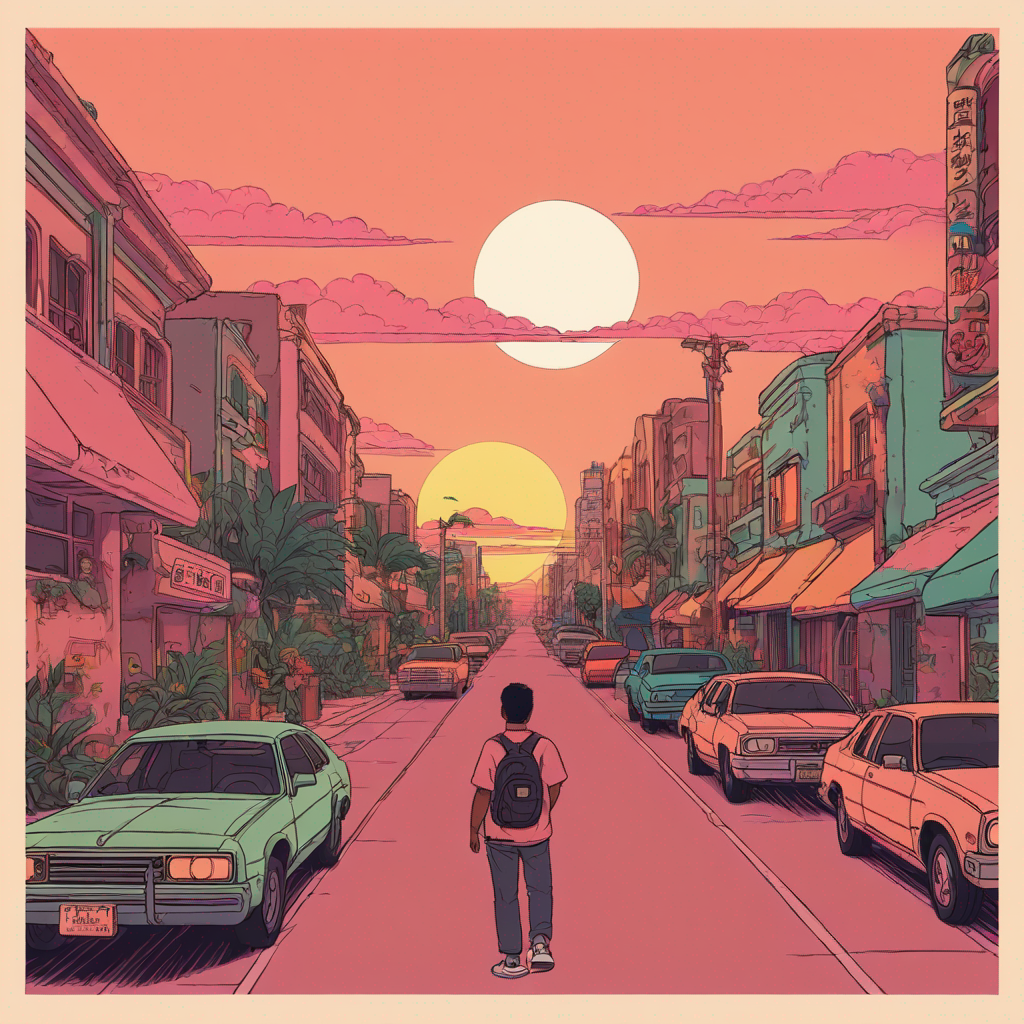 an Okaybear wearing pink hoodie on top of a skyscrapper admiring citys...