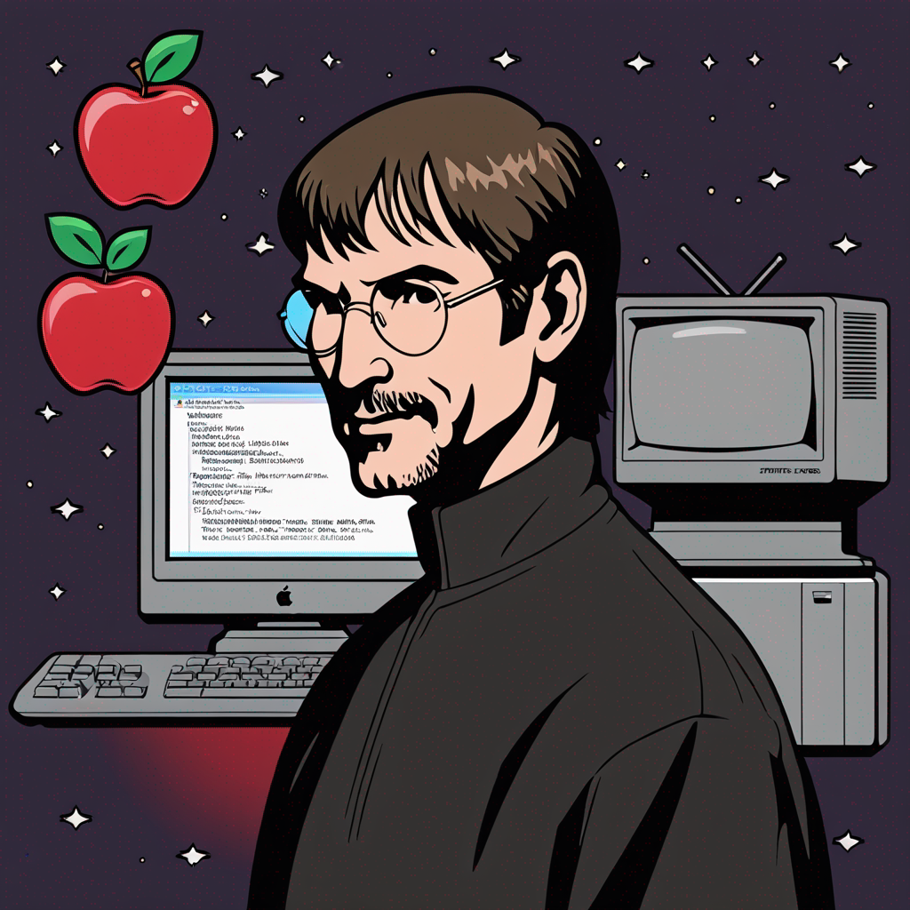 legendary steve jobs, with macintosh classic, and apple classic logo background