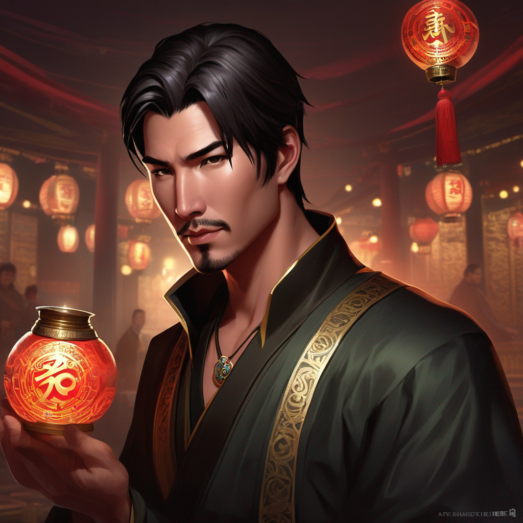 imagine a psychic gambler, a generous asian man always bringing luck, short dark hair, no mustache or beard, a character portrait by Magali Villeneuve, Artstation contest winner, cobra, concept art, official art, wiccan, extra shadow