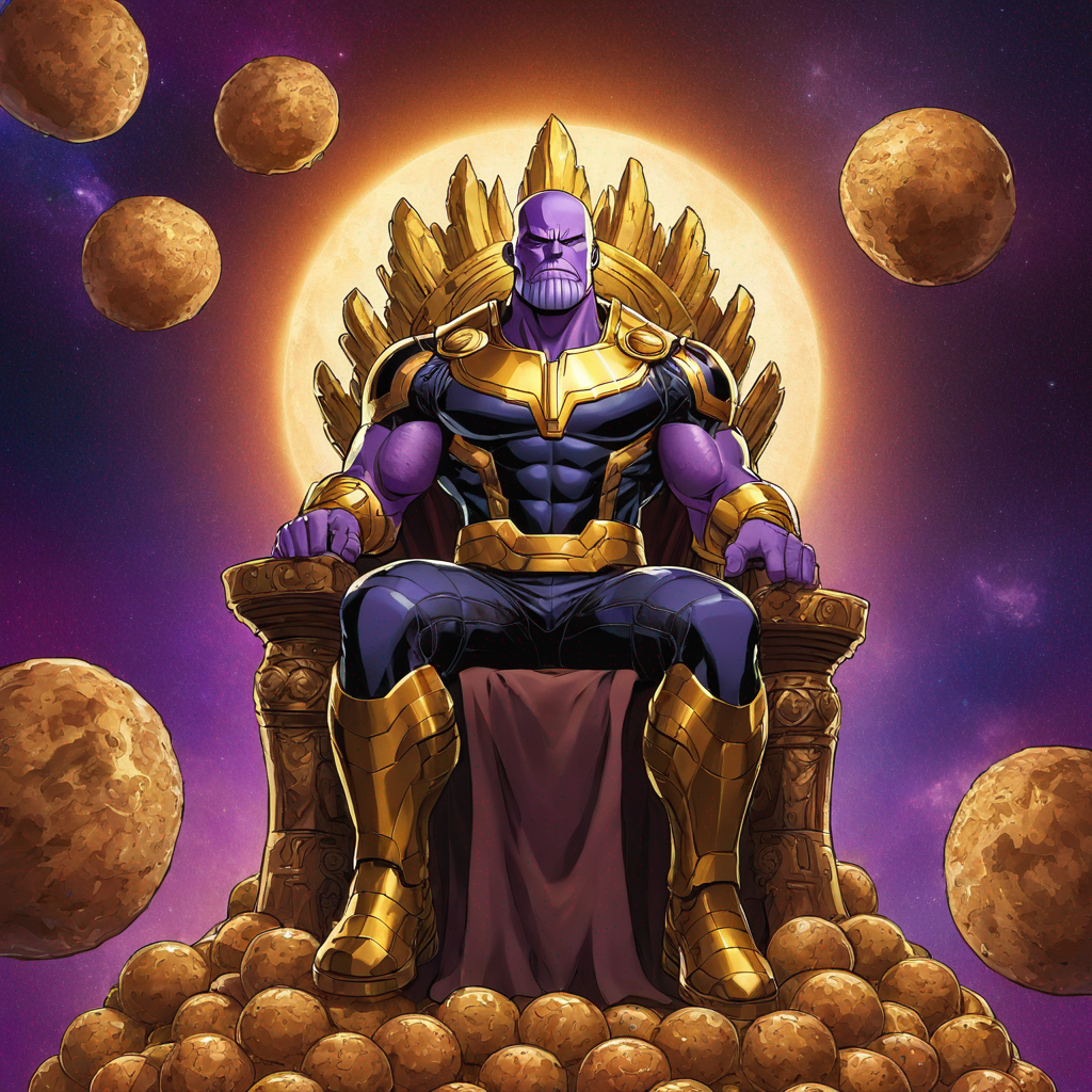 thanos sitting on his throne. Solana coins falling from the sky