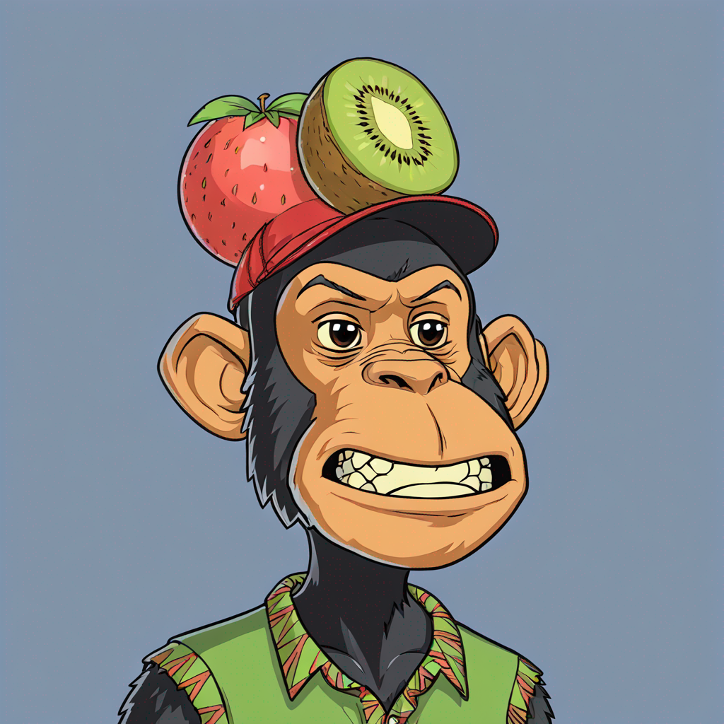 Chimp holding large kiwi fruit above his head