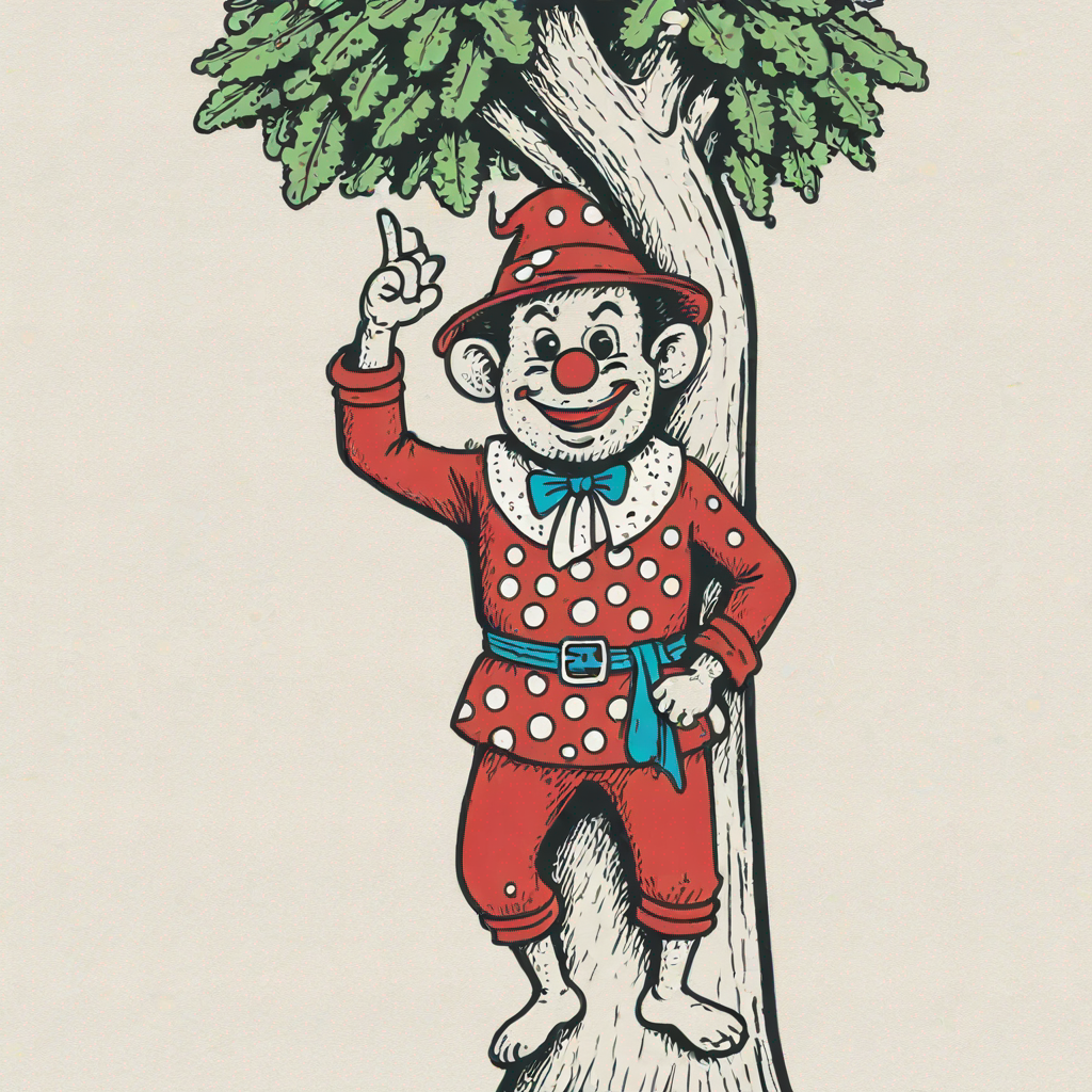 a bozo wearing beach costume climbing on tree