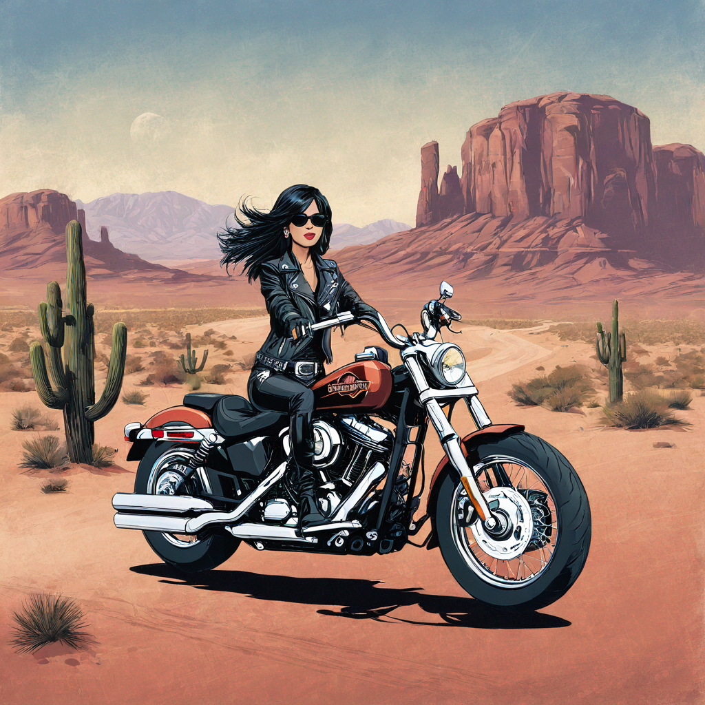 A lady riding Harley Davidson in the desert
