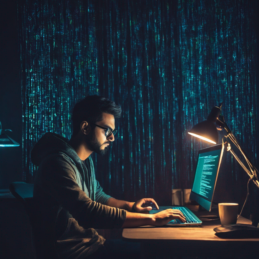 hacker guy coding in the dark room