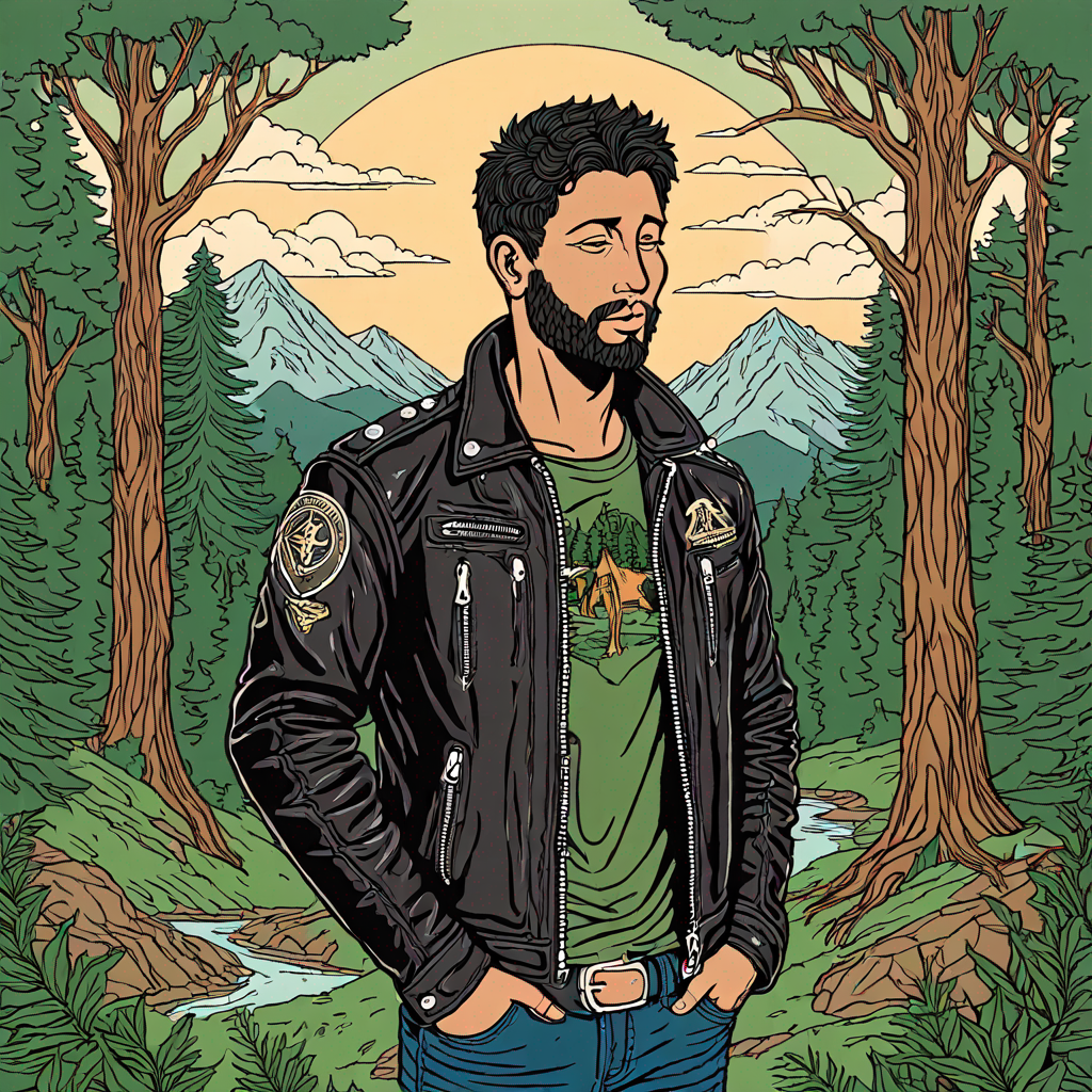 degod wearing a leather jacket, forest landscape