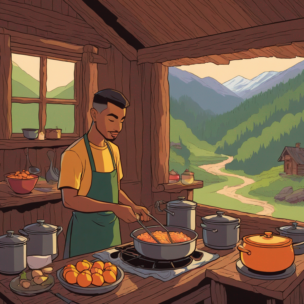 a lotus lad cooking dinner in a remote mountain cabin