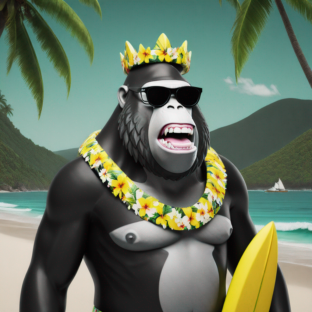 degenerate ape on jamaica beach holding surfboard wiht sea in the background