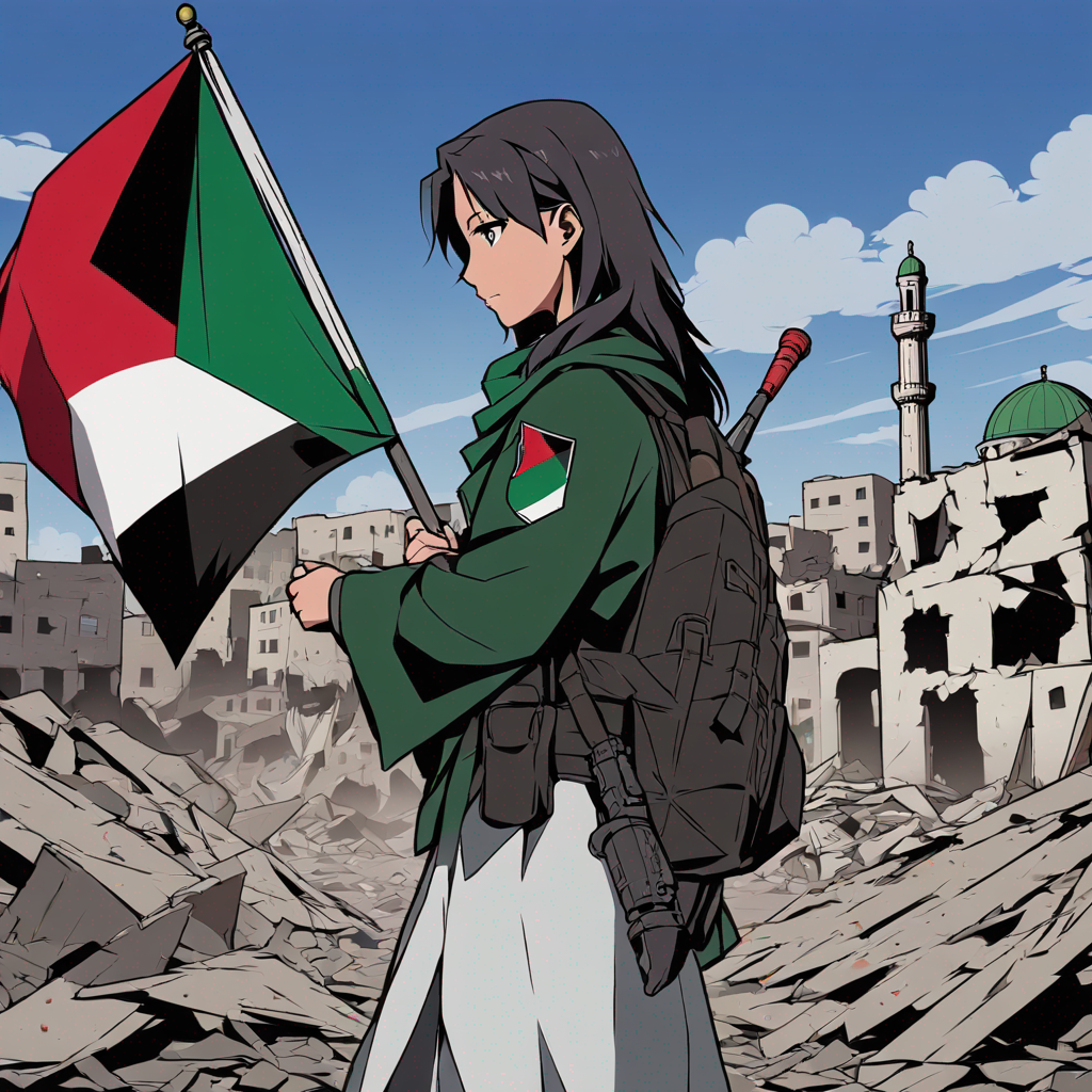 an azuki holding a palastine flag on the walls of gaza, ruined gaza ci...