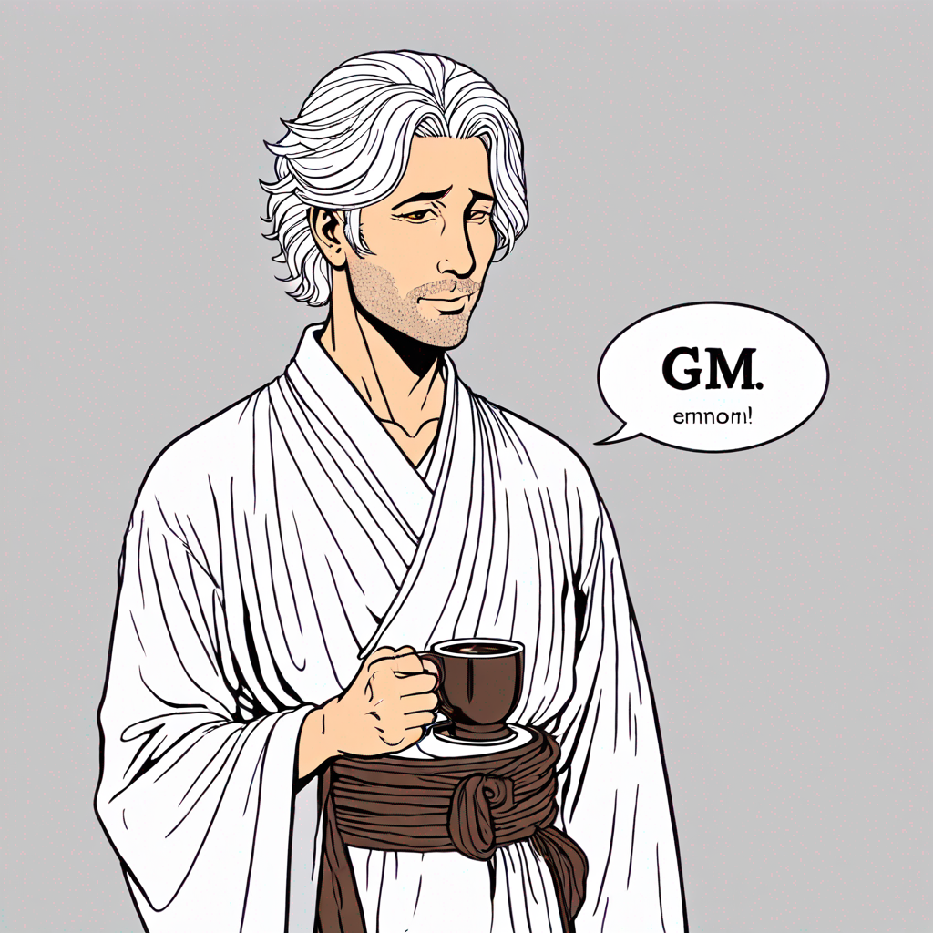 a white haired sensei, wearing a white dress, holding a cup of coffee, text bubble says "GM"