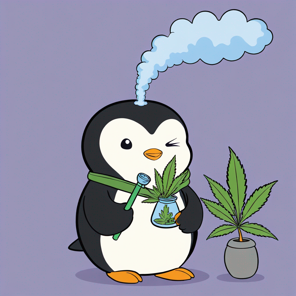 A penguin blowing smoke rings, holding a weed bong
