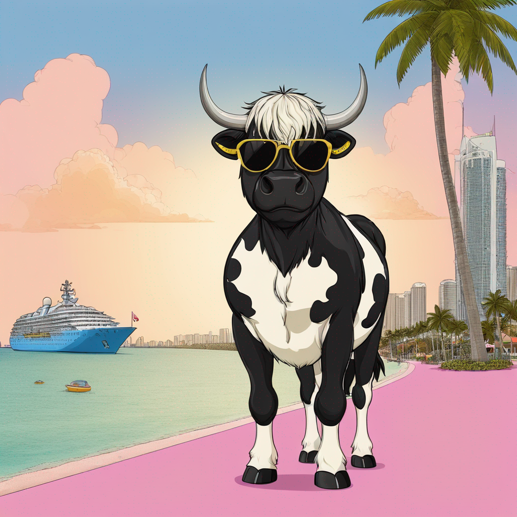 a humanized Cow Cow full-body with sunglasses in miami with a yacht on...
