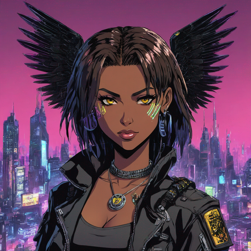 brown skinned girl with deadlocks, in cyber punk anime style, with cyberpunk weapons, the background matched the cyber punk city, and winged liner black eyes, with a tough mature face, with big long black wings