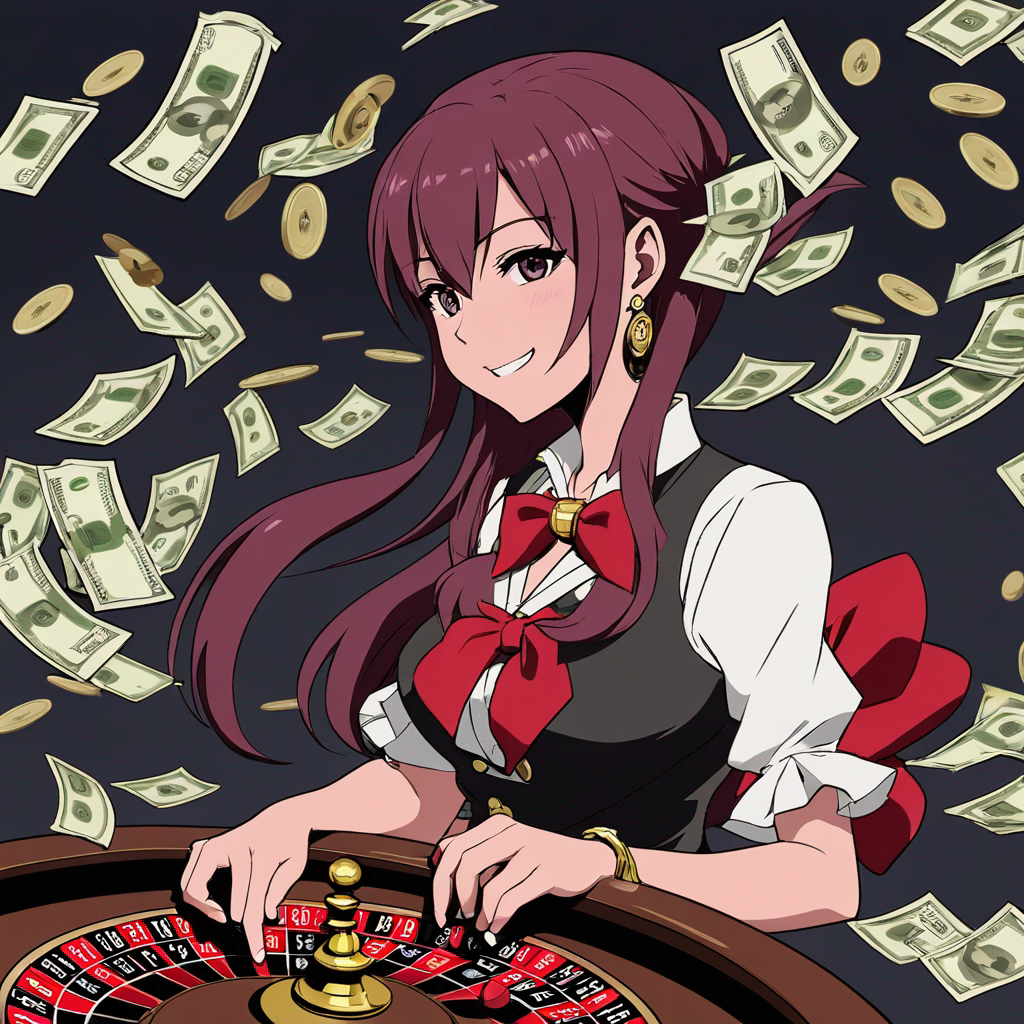 an azuki playing roulette and roulete wheel make a tornado while spinnig and sucking up dollars