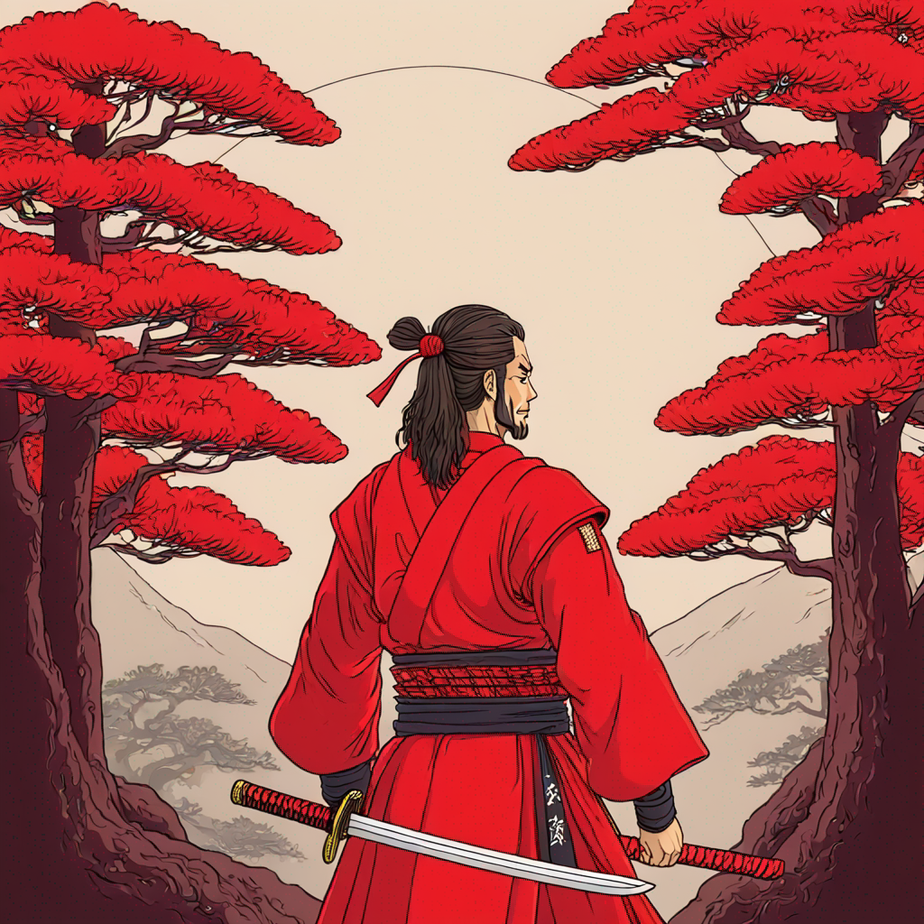 Samurai y00ts with a katana on the back, red themed traditional clothing