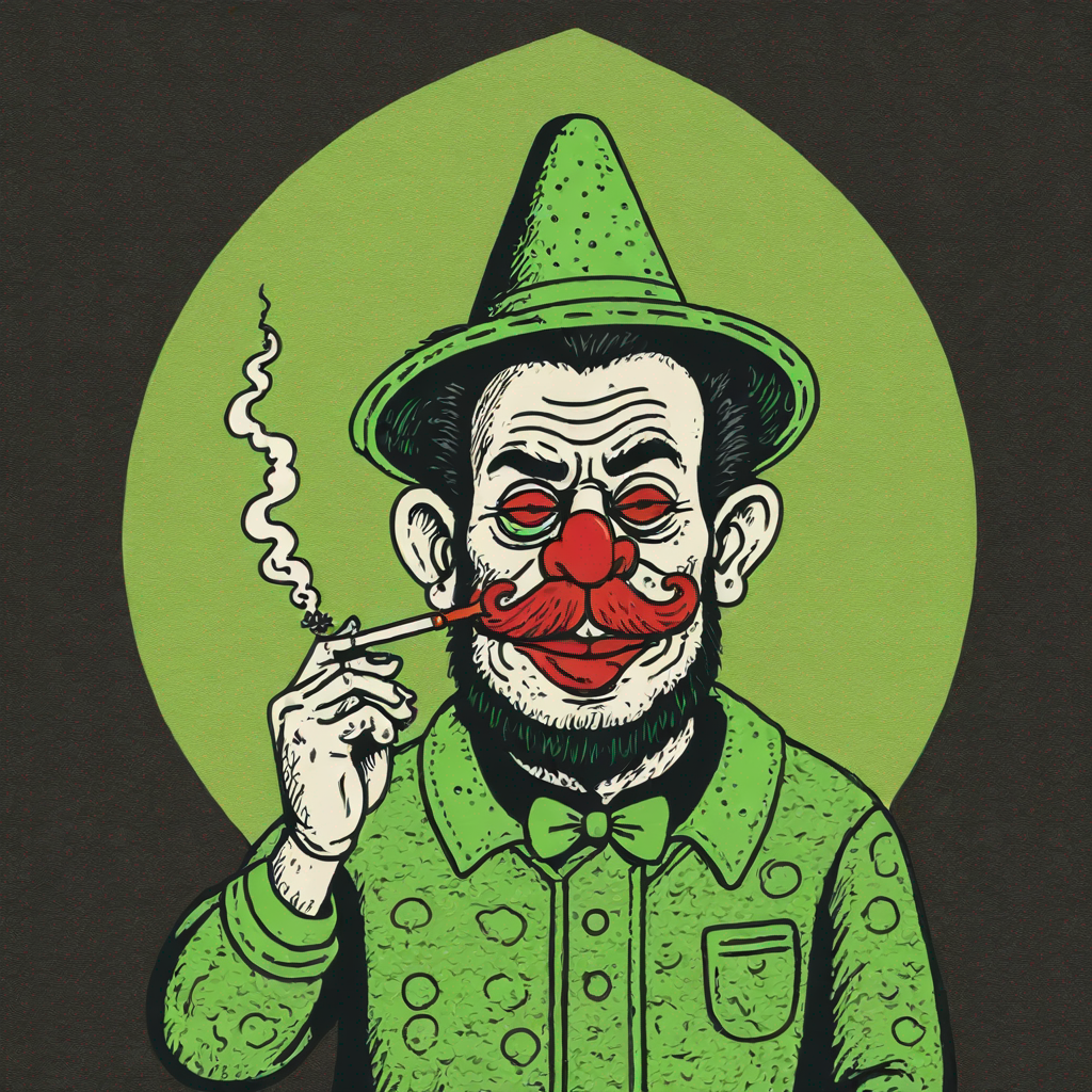 Bozo smoking a joint, smokey room, dark with lime green colors