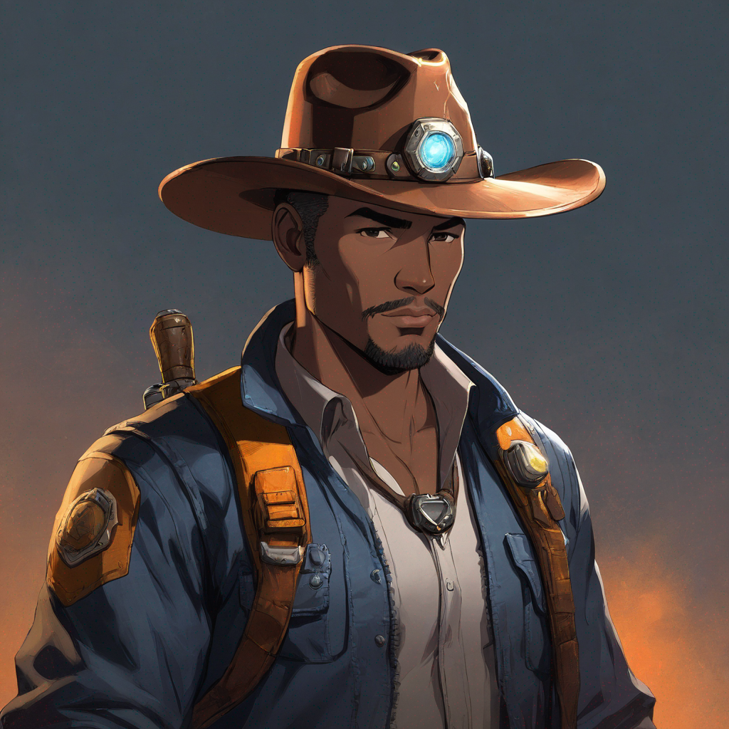 miner with a cowboy hat, clearly visible futuristic mining shovel on his back, a character portrait by Magali Villeneuve, Artstation contest winner, cobra, concept art, official art, wiccan, extra shadow